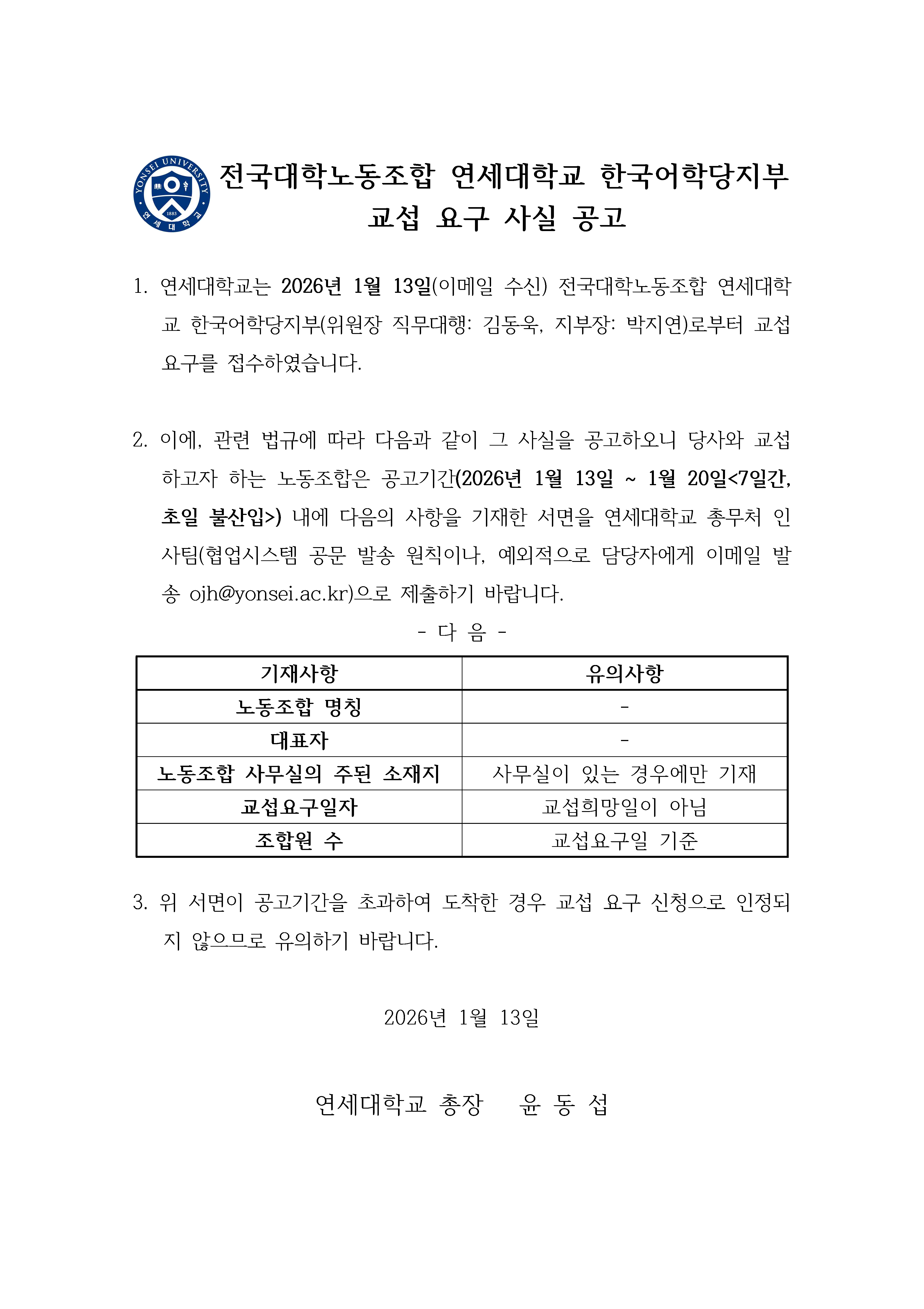 전국대학노동조합 연세대학교 한국어학당지부 교섭 요구 사실 공고
